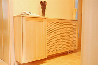 Heizkörperverkleidungen sind individuelle Maßanfertigungen, abgestimmt auf Ihr Wohnambiente. Die Herstellung erfolgt aus kammergetrockneten Massivhölzern, diese garantieren Verzugsfreiheit der Rahmen. Die Füllungen können z. B. in Diagonal- Rechteckgitter oder mit Stabfüllungen angefertigt werden. Die Aufhängungen der Innenrahmen bestehen aus Metall, sie sind kipp- oder drehbar und mit einem Handgriff auszubauen. Die Versiegelung der Oberflächen kann wahlweise farbig o. mit Klarlack erfolgen.